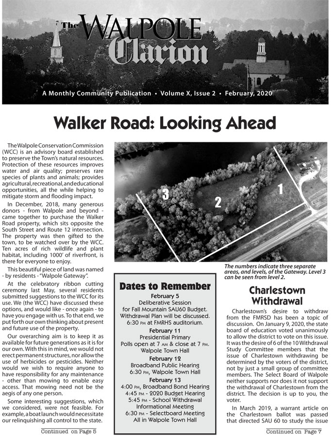 The deadline for the March 2020 issue is 21 February. It is your providing articles to share with the Walpole, North Walpole, and Drewsville community that makes the CLARION work. And particularly it is the advertisers that make it happen, so thank them, and patronize them.