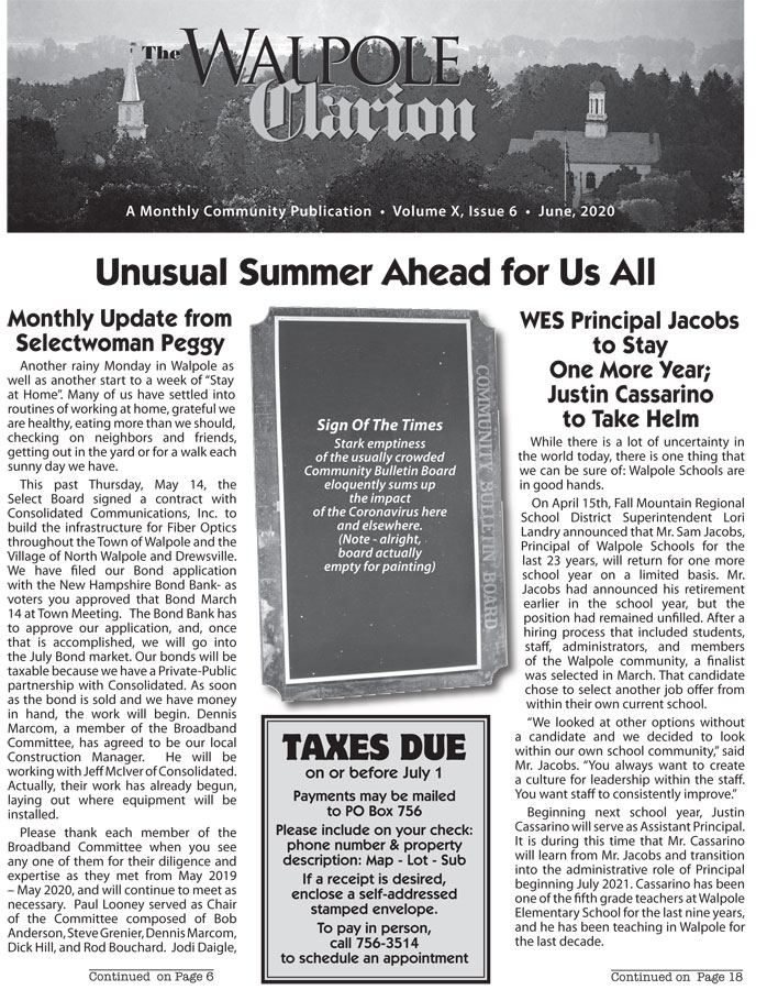 The June issue of the CLARION is now on-line, and again twenty four pages, in spite of the lack of past events to report on, and lack of events in June. Sadly, Old Home Days, which we would have been enjoying the end of the month, was rescheduled to 2021.