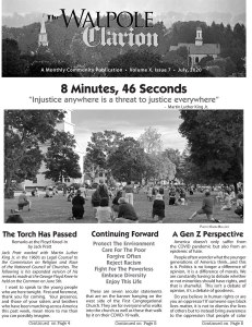 The July twenty page issue of the CLARION is now on-line. The content of the June and July issues, of necessity, shifted from relating past events, and highlighting upcoming events. With COVID-19, events have been cancelled, thus nothing to report to you. However, in both the June and July issues, I was pleased to bring to the CLARION’s pages a number of feature articles/pieces to inform and entertain you. June included articles on: Walpole water; a welcome parade; Kiniry’s Barn; and, Abingdon Spares. The July issue, sadly, has articles relating to the murder of George Floyd, and Walpole’s response. August (and possibly the rest of 2020) could also lack past and future news events. So if you have an idea of something you would like to read about in the CLARION, send me your idea. Or, better yet, send an article for publication consideration.
