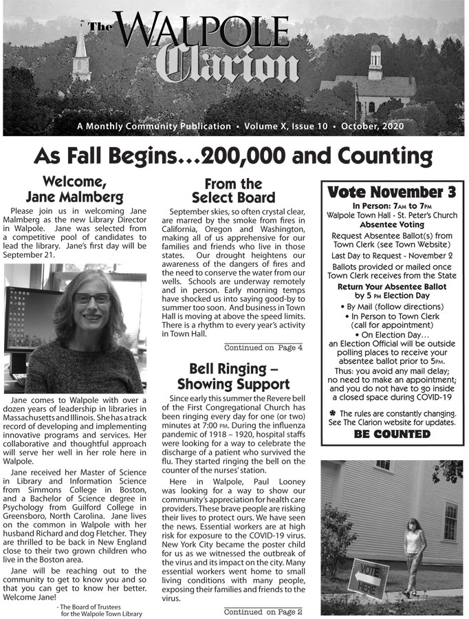 The October issue of the CLARION, again twenty-four pages, should be in the mail on September 29, but it is is now on-line for you to read early and share. Town news, the primary election, a great deal new at the libraries, four reader’s commentaries, some “Gleanings from Town Minutes,” and much more of interest. Take a look, see what is happening in Walpole. And, please remember, you have the CLARION’s advertisers to thank for bringing you the CLARION, so please extend your thanks when you see them, or need them.