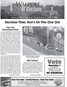 Yes, already the eleventh month of this most different year. But moving right along anyway, the November 2020 issue of THE WALPOLE CLARION is now on-line for you to browse and read. Your “hard copy” in now in the mail, and you should be receiving it in a day.