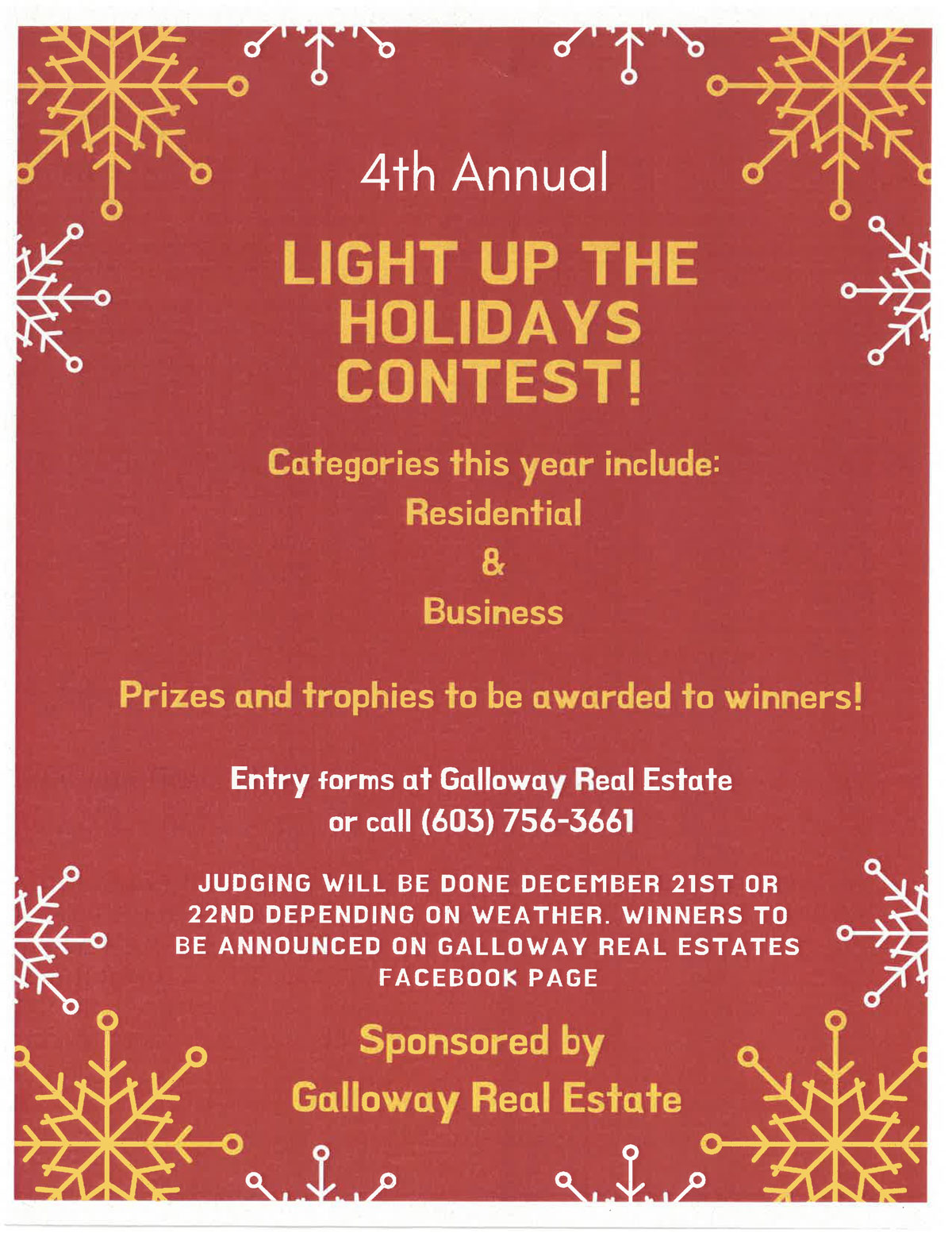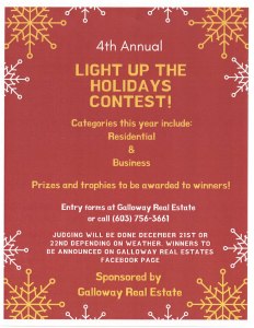 Again this year Galloway Real Estate is sponsoring a contest to brighten up around Walpole with prizes and trophies awarded in two categories – residential and business. So, click on the image ( or this link ) for more information, get your entry form, and start decorating. Happy Holidays, yours, RAY BOAS, Publisher