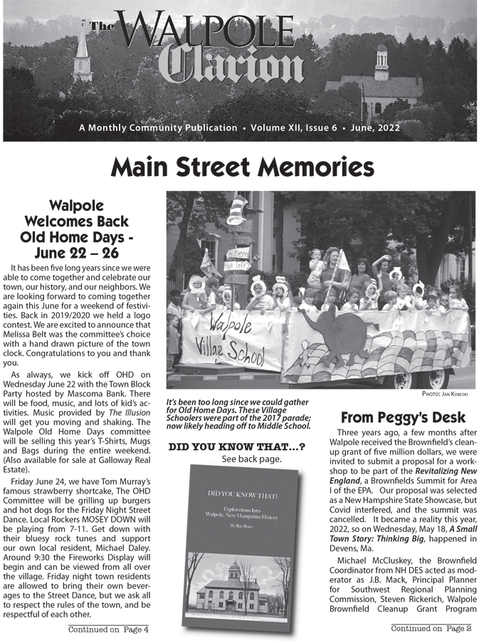 Yes Memorial Day approaches with the post office closed on Monday for the holiday, and Howard Printing finished up a tad early so I could get June in the mail to you. And, in the centerfold of this issue you will find the entire schedule for OLD HOME DAYS 2022 beginning Friday June 25 for the weekend, and with a Block Party to start the excitement on Wednesday the 23rd. If you would like to print out the schedule you can do so from the sidebar link on the CLARION website. Just CLICK ON THIS LINK for the PDF of the June issue, or on the front cover below.