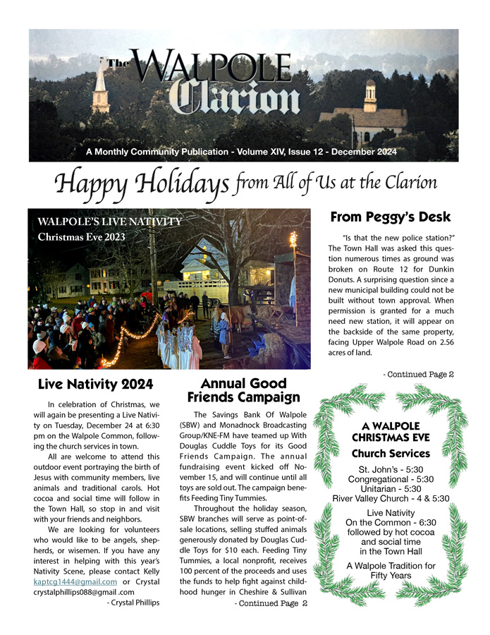 And your hardcopy is at the post office for delivery to you soon – maybe even to read while your turkey is cooking. Holiday happenings are included on the pages for your planning – and most important the Live Nativity on the Common Christmas Eve, continuing a Walpole five decade tradition.