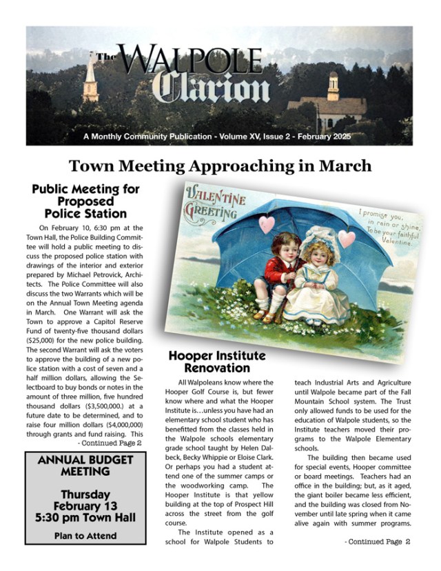 It seems as only yesterday I emailed you — but time again to tell you your February 2025 CLARION is now on-line for the world to enjoy. Your hardcover copy is at the post offices for delivery to you shortly. The Town Meeting cycle has again begun, and you will be introduced to the Warrant Articles in the February issue, with more to follow in March in the Town Meeting issue.