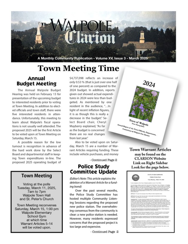 It is Town Meeting time, and now on-line the March CLARION has information to assist you in casting your ballot on Tuesday March 11, and join the conversations on Saturday March 15. Explained are Articles 2 and 4, and you will find a link to read all the Warrant Articles on the CLARION website.