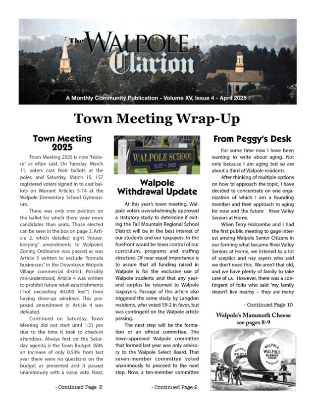 And at the post offices for delivery to you shortly – No Foolin’. Twenty pages with Town Meeting wrap-up; up-coming outdoor and nature events; Priscilla continues with some unique “sunshine” events; Hooper Institute has announced coming summer programs; and, learn of a “new discovery” – Walpole’s Mammoth Cheese.