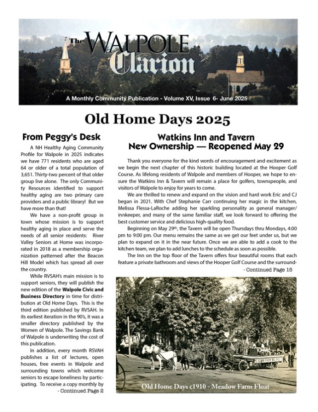 The OLD HOME DAYS June issue is in my van having picked it up this evening at the printer, and will be at the post offices early on the 30th for delivery to you shortly – Twenty pages for you packed with details on Old Home Days, including a center two page schedule and details of activities June 25-29. You will want to save this issue for your planning to have fun to enjoy the festivities and celebrations.