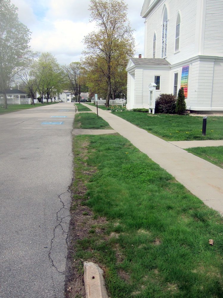 An open spot of the present “concrete bumper” barriers near the south doorway to the church office. Note the lack of grass due to tires that have left the roadway resting on the the former grassy area.