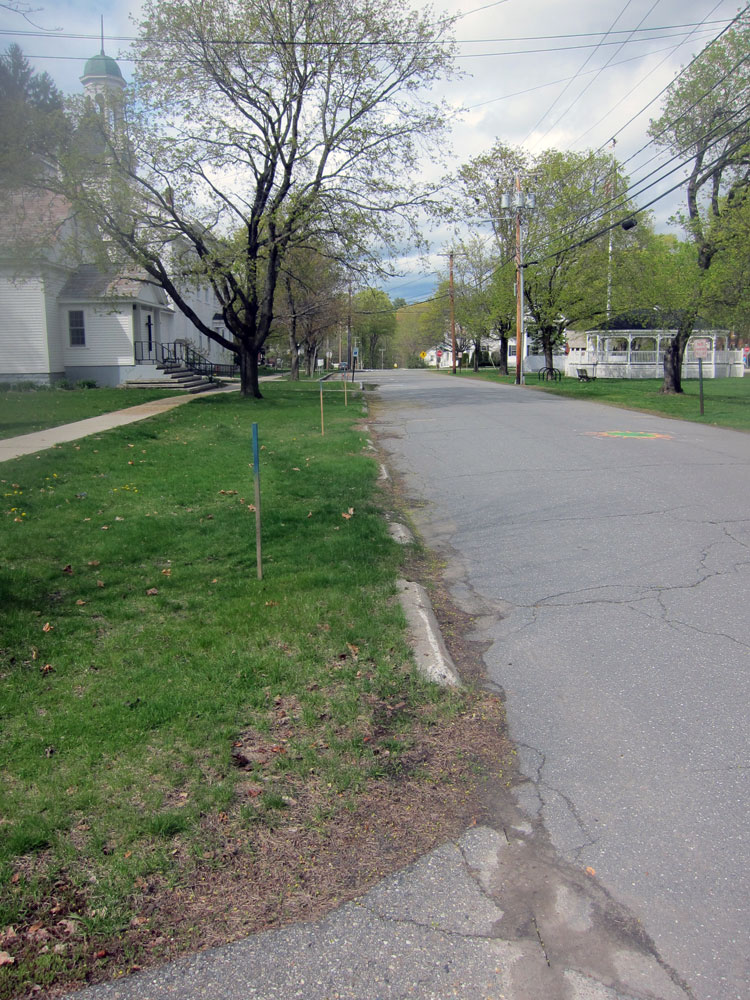 East side of the Common, looking north on Washington Street, in front of the Congregational Church Parsonage. Seldom, if at all, are any cars parked at this point. Thus no damage to the tree lawn because vehicles have not been parked here.