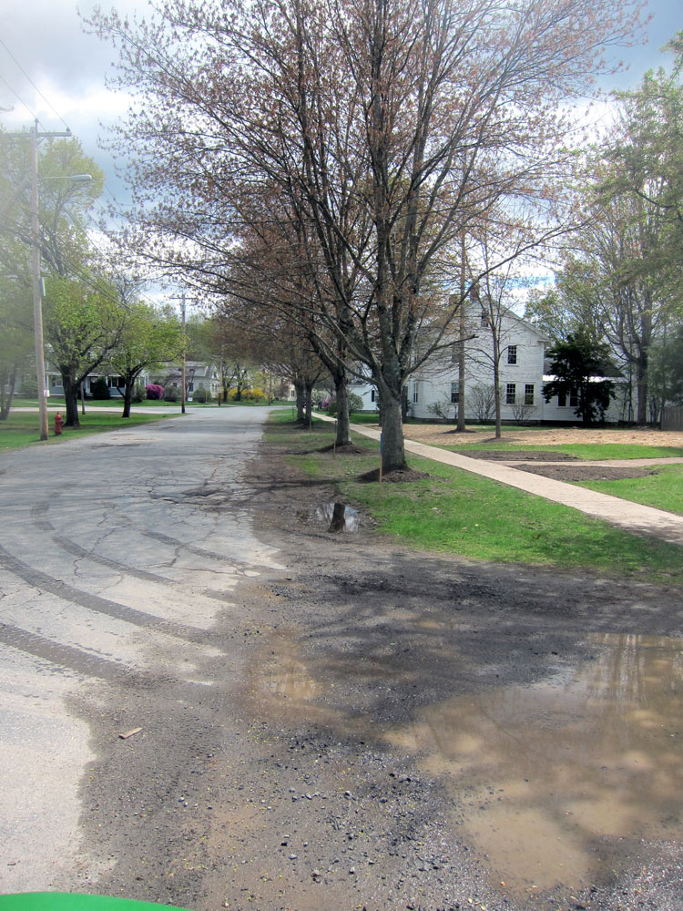 Looking south from the drive at 44 Elm Street. There has never been curbing from this drive south. As parking fills up from the Town Hall south, cars will pull off the road into this grassy area. As a result the earth has been compacted, no grass grows, and water accumulates following a rainfall. Water that has accumulated and penetrated the ground has probably contributed to the cracking in the pavement areas.
