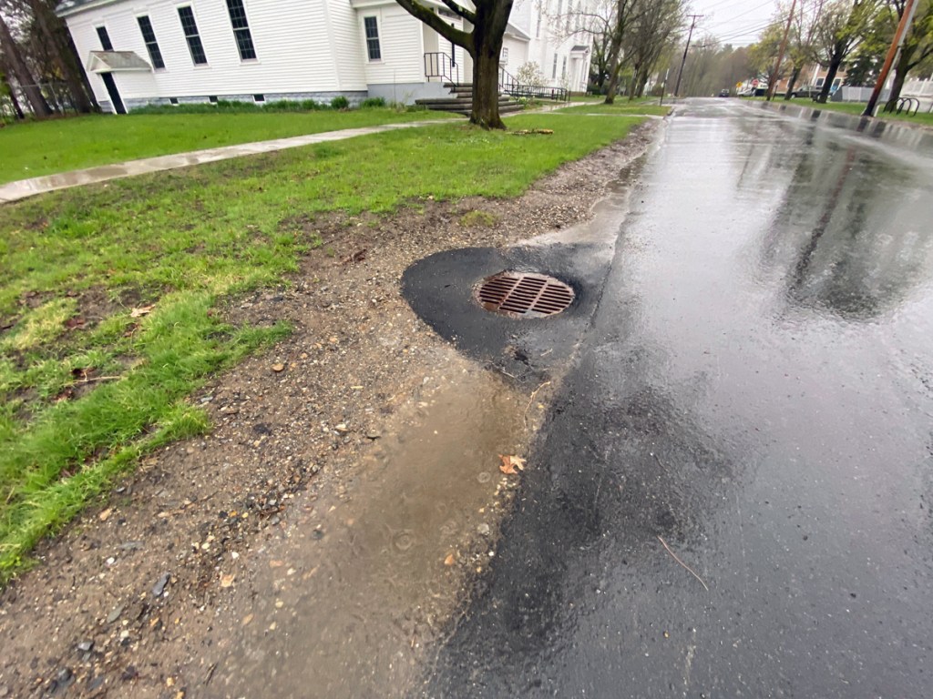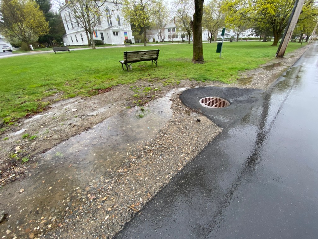 May 4, 2022 UPDATE in rain. One of the advantages of curbing is it channels rain water runoff to storm sewers. Of course the curbing must be properly installed adjoining the roadbed, and be properly sloped. Awaking May 4, 2022, to rain I hustled outside to capture images of what I have seen during and after each rain on Elm Street the past year. Water accumulates in the dirt that replaced grass and creates puddles to create mud. This instead of streaming into the storm sewers. Below are today’s two sad views showing the complete lack of understanding by the Walpole Highway Department on how to finish off roadsides and handle water.