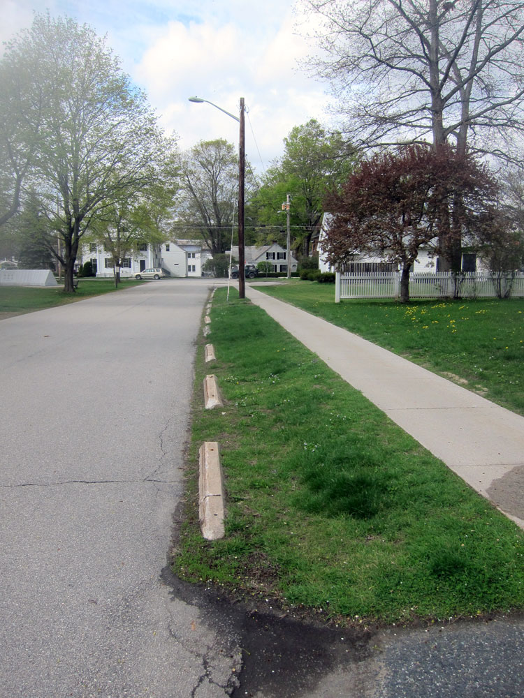 Note some of the “concrete bumpers” are compacted into the ground over many decades. This has not happened to the same degree on Washington Street since there is much less parking. Without these “bumpers,” serving as curbing on Elm Street, vehicles would have compacted the soil, killed grass, and created dangerous mud slicks with possible liability issues for the Town.