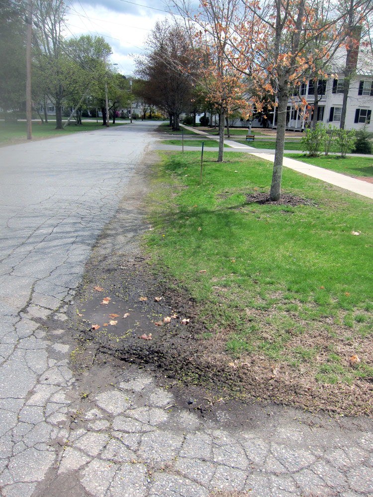 SUMMARY – As you look at the “concrete bumpers” on Elm Street, and on Washington Street, as compared to areas lacking any form of curbing, it is important to see the positive effect the “bumpers” have contributed. The majority of parking during the day is on Elm Street along the section seen directly above and below. The bumpers have defined the edge of the road. Cars and trucks come and go throughout the day, often bumping into the “bumpers” as intended. As a result, cars have not crossed into the “tree lawn” and depressed the soil causing low spots to catch water.
