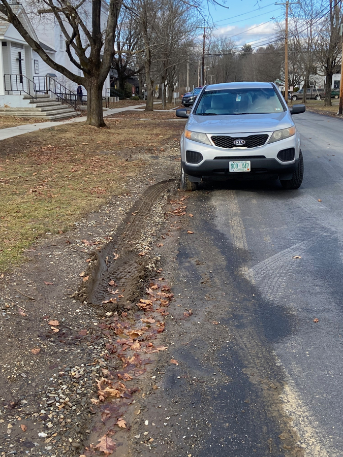 again reported to Selectboard – no reply, no concern – note the gravel recently placed by Highway Department that with plowing is strewn over grassy areas.