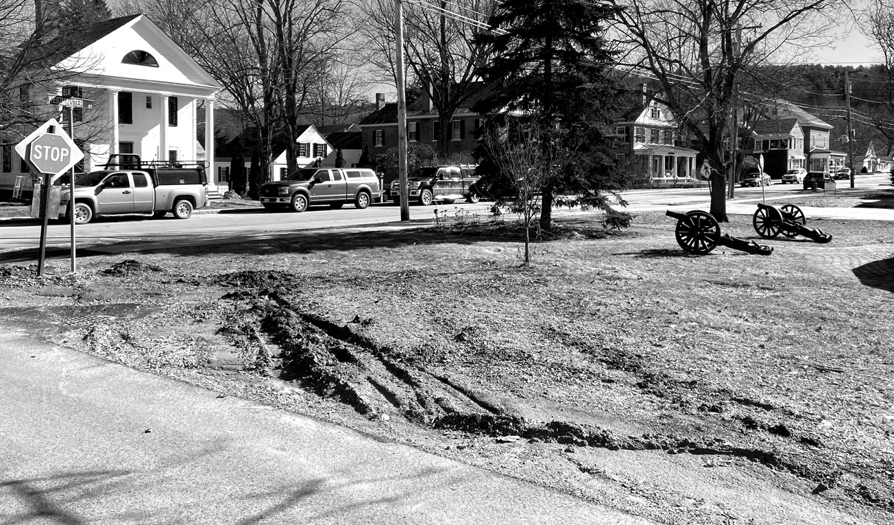 Image below, taken 21 March 2022, shows damage done to the northwest corner of the Common done by Walpole’s Highway Department plow operators. In my twenty years of living “on the Common” this wanton disregard of caring has never occurred. This image was shared with the community in the April issue of THE WALPOLE CLARION.