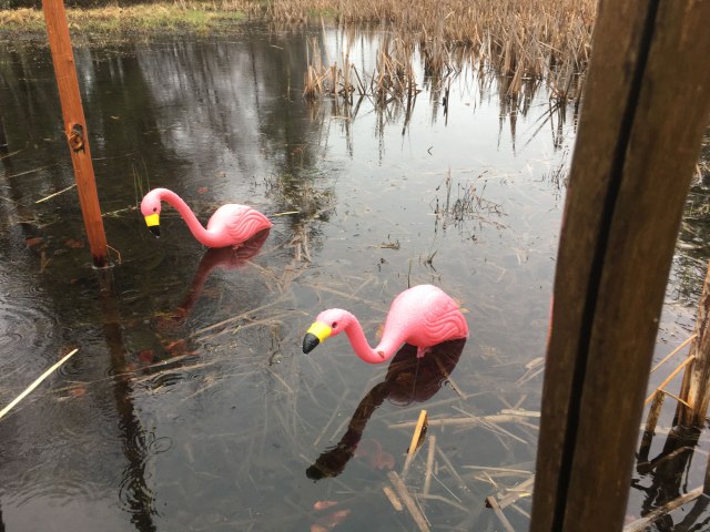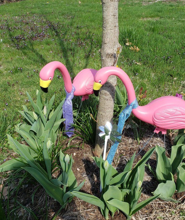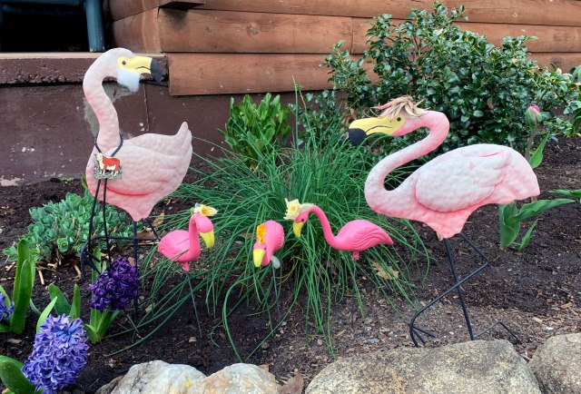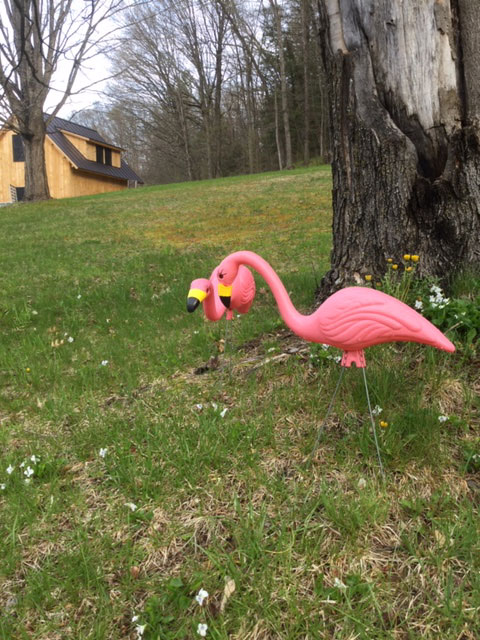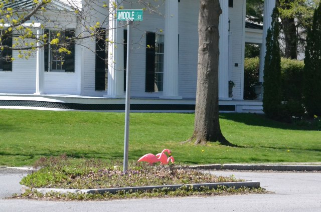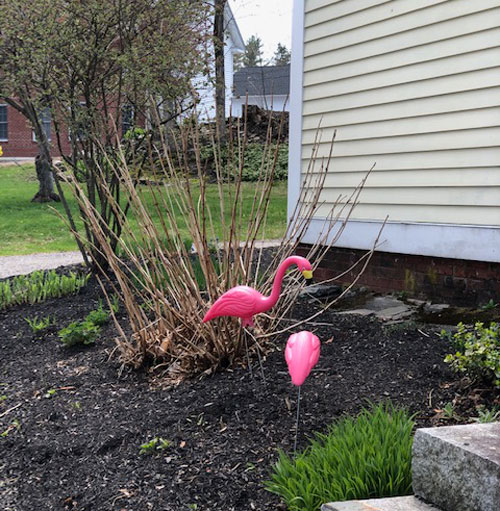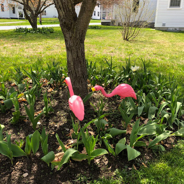 and, below left, Pamela S. shared this “anemic pair” — and to the right, Caroline A. claims that her Oliver and Danny “were some of the first flamingos to arrive in Walpole, over on Maplewood Circle.” Are your images next?