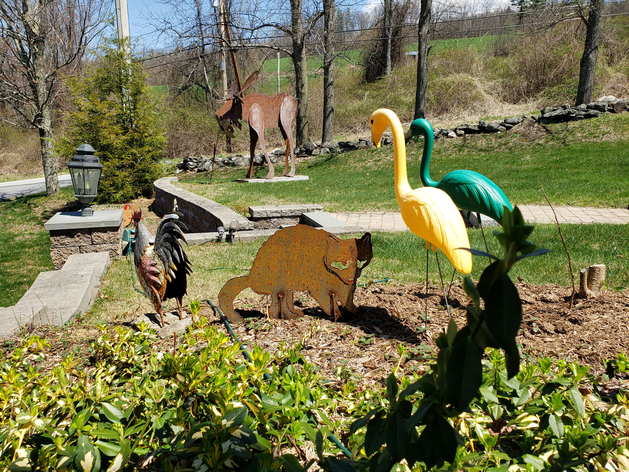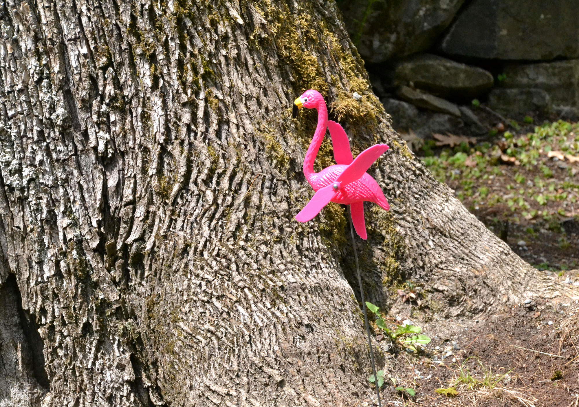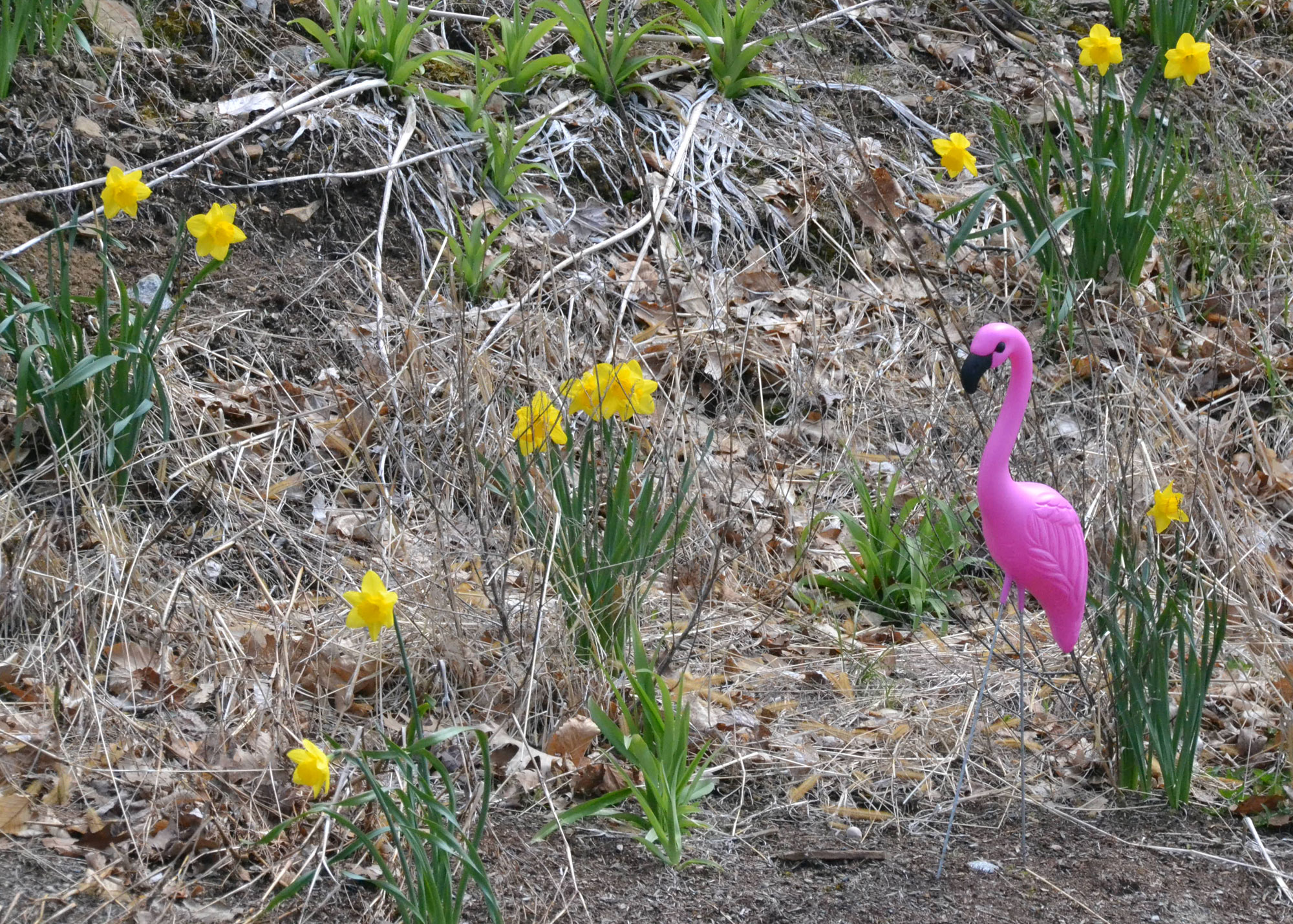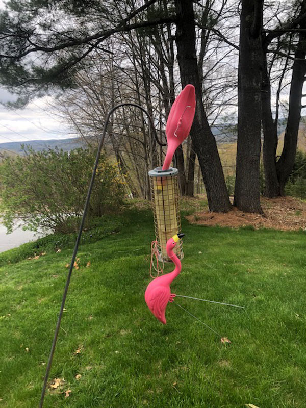 On 13 May I received an email from Jana S. with two more images of the “seed thieves” above. She said, “These are the 2 flamingos that we found on our lawn on Sunday! Note – the bird feeder is not ours. It was part of the flamingo installation.” – So whoever is creative flying birds to new locations is adding great props also – THANK YOU