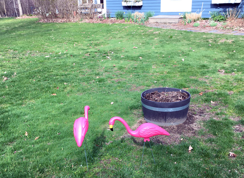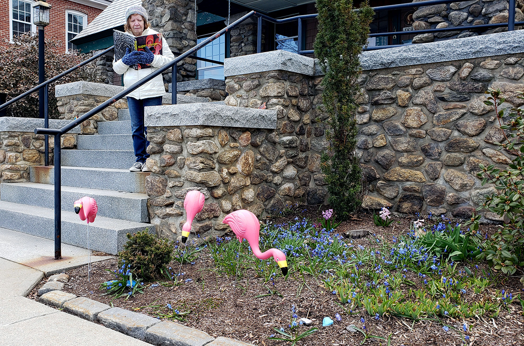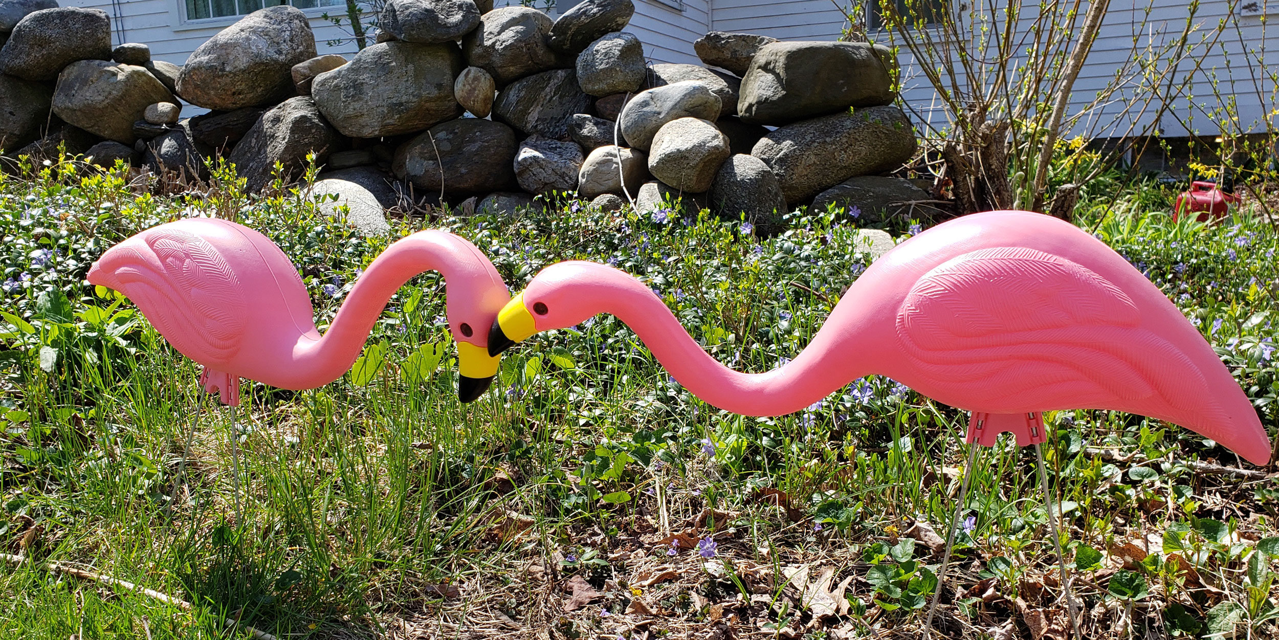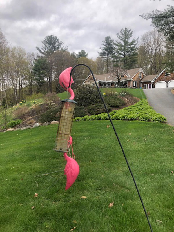 and, below left, Pamela S. shared this “anemic pair” — and to the right, Caroline A. claims that her Oliver and Danny “were some of the first flamingos to arrive in Walpole, over on Maplewood Circle.” Are your images next?