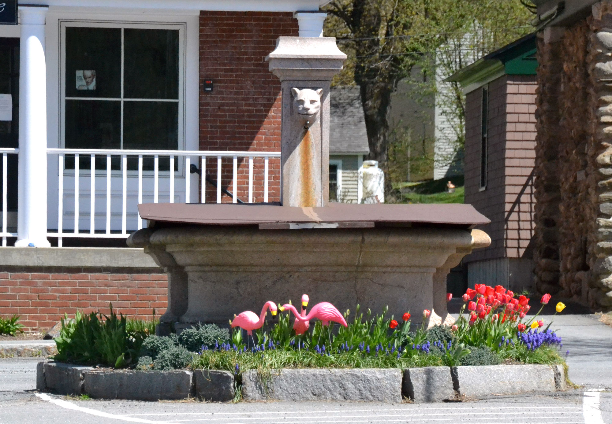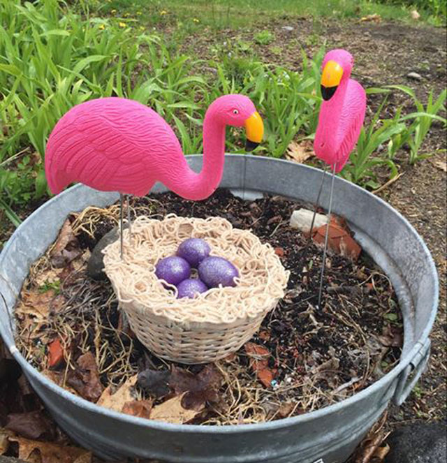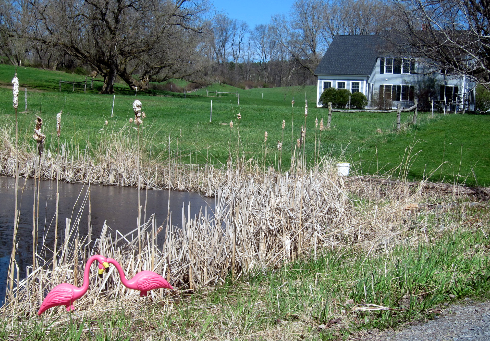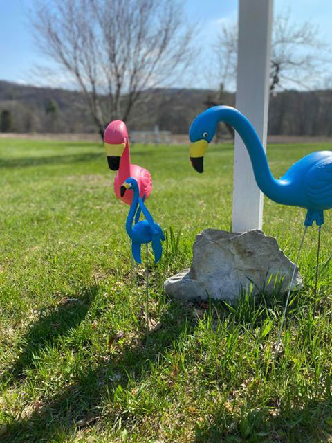 and, below left, Pamela S. shared this “anemic pair” — and to the right, Caroline A. claims that her Oliver and Danny “were some of the first flamingos to arrive in Walpole, over on Maplewood Circle.” Are your images next?