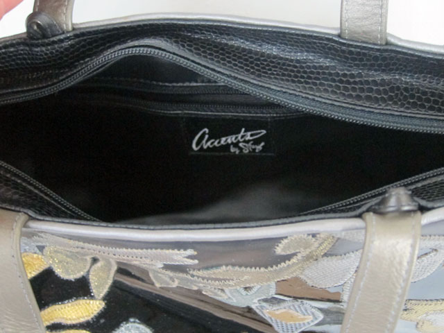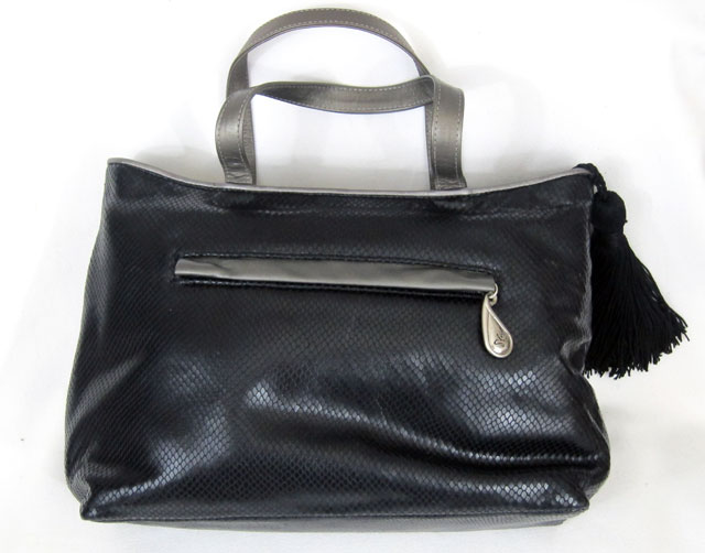 This gorgeous and luxurious bag is a beautiful combination of fabric and leather, in a true satchel form. The fabric is a velvety soft pattern of black and silver, with black leather trim around the top, sides and bottom. Extremely plush and lush! Roomy yet not overpowering, this bag measures 11” high by 18” wide and 5” deep. The two 7 ½” padded leather handles can be held comfortably in the hand or casually draped over an arm. When unzipped, the large opening (lined with logo fabric, of course!), has enough room to hold all of your essentials. Plus the inside zippered compartment and two open pockets will keep your most often used items (keys, pens, cards or phone) within easy reach.