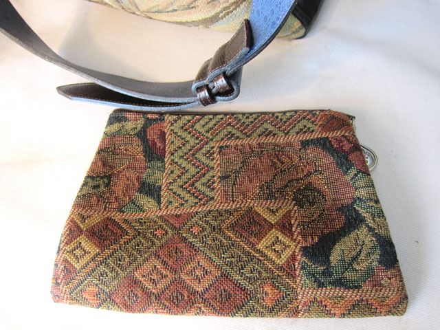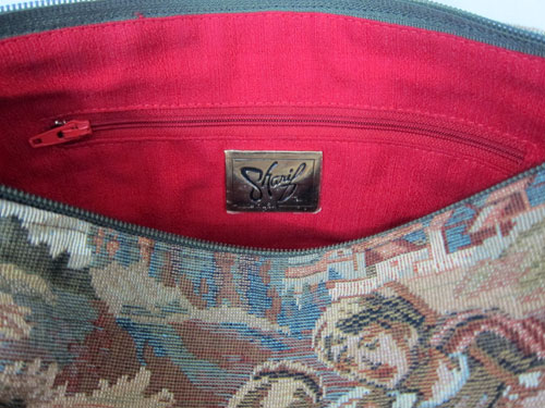 About This Bag — Beautiful tapestry bag (9” high by 14” wide by 4” deep) features a zip top, leather sides and footed bottom. Adjustable 1.5 wide” leather shoulder strap. Red fabric interior with one zipper compartment and two pockets. Bonus zipper zipped bag. The entire package comes with original Sharif net bag. Exceptional all around.