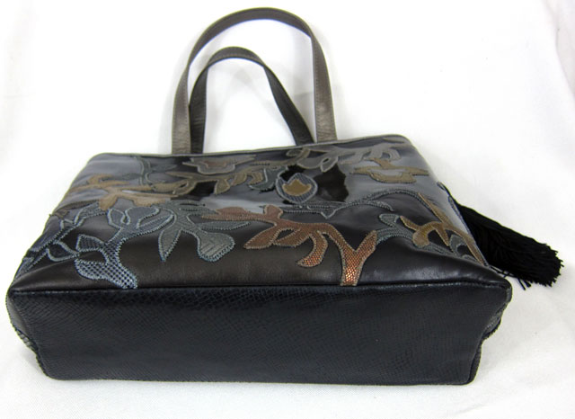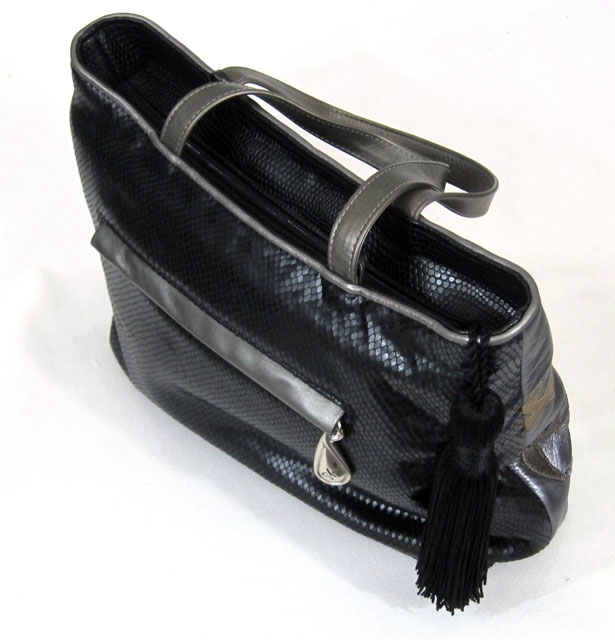 This gorgeous and luxurious bag is a beautiful combination of fabric and leather, in a true satchel form. The fabric is a velvety soft pattern of black and silver, with black leather trim around the top, sides and bottom. Extremely plush and lush! Roomy yet not overpowering, this bag measures 11” high by 18” wide and 5” deep. The two 7 ½” padded leather handles can be held comfortably in the hand or casually draped over an arm. When unzipped, the large opening (lined with logo fabric, of course!), has enough room to hold all of your essentials. Plus the inside zippered compartment and two open pockets will keep your most often used items (keys, pens, cards or phone) within easy reach.