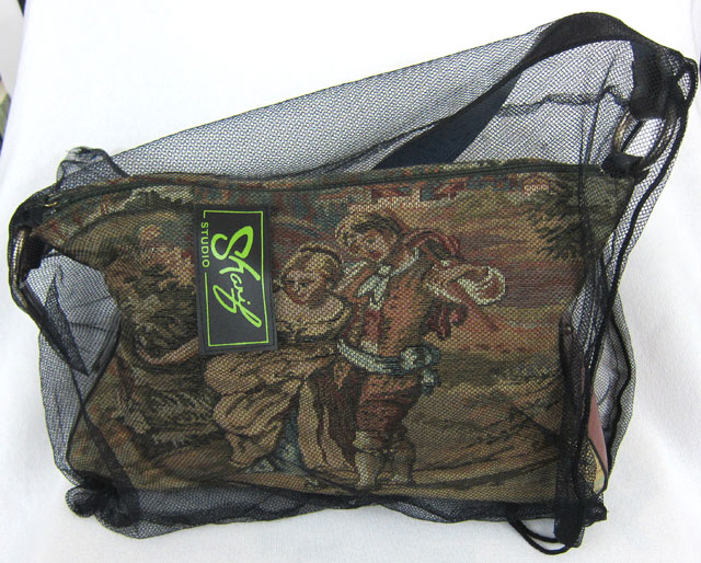 About This Bag — Beautiful tapestry bag (9” high by 14” wide by 4” deep) features a zip top, leather sides and footed bottom. Adjustable 1.5 wide” leather shoulder strap. Red fabric interior with one zipper compartment and two pockets. Bonus zipper zipped bag. The entire package comes with original Sharif net bag. Exceptional all around.