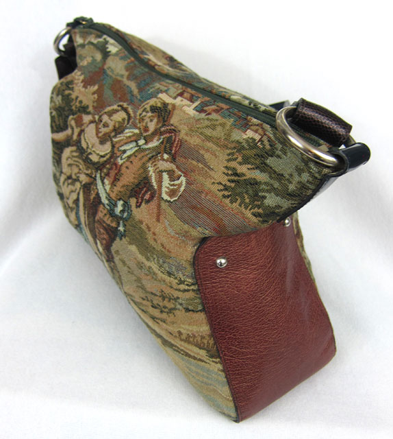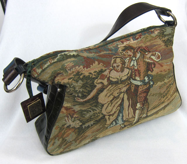 This gorgeous and luxurious bag is a beautiful combination of fabric and leather, in a true satchel form. The fabric is a velvety soft pattern of silvers, blacks and browns, with brown leather trim around the top, sides and bottom. Extremely plush and lush! Roomy yet not overpowering, this bag measures 11” high by 18” wide and 5” deep. The two 7 ½” padded leather handles can be held comfortably in the hand or casually draped over an arm. When unzipped, the large opening (lined with logo fabric, of course!), has enough room to hold all of your essentials. Plus the inside zippered compartment and two open pockets will keep your most often used items (keys, pens, cards or phone) within easy reach.